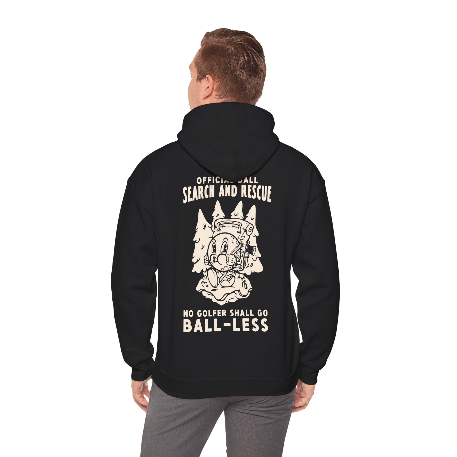 Hit the course with a smile and a little woodland swagger with this vintage cartoon “Official Ball Search & Rescue” hoodie. The design features a whistling golf ball character trekking through the woods, decked out with a hiker’s pack, boots, and a determined mission: find those lost balls no golfer should leave behind. Surrounded by classic rubber-hose style trees, this cheerful little scout brings old-school animation charm with a sarcastic, tongue-in-cheek twist. Finished with the bold motto: “No Golfer Shall Go Ball-Less.”